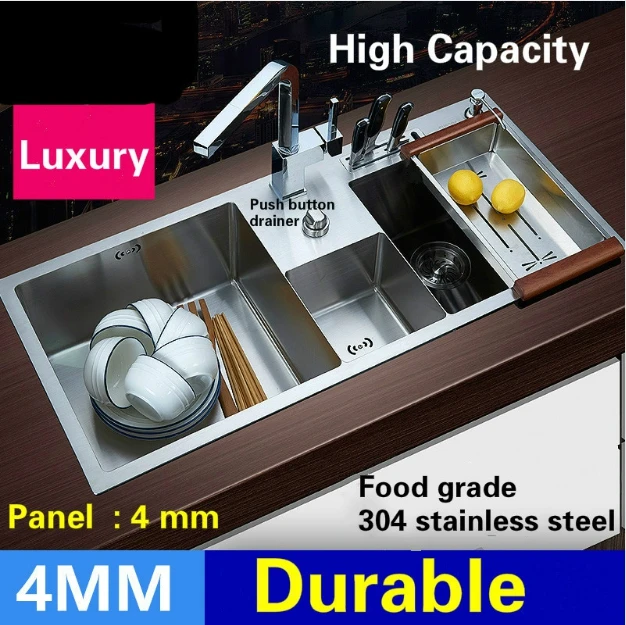Special Offer Free Shipping Apartment Big Kitchen Manual Sink Double Groove Push Button Drainer 304 Stainless Steel Hot Sell 960x430 MM Discount 0% Today!
